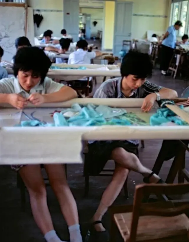 这是苏州的绣厂,长条绷子架起来,姑娘们把丝线抖开,灯下一个色接着一个色,针脚细得像头发,小时候路过窗外,总能听见嗒嗒的梭声。