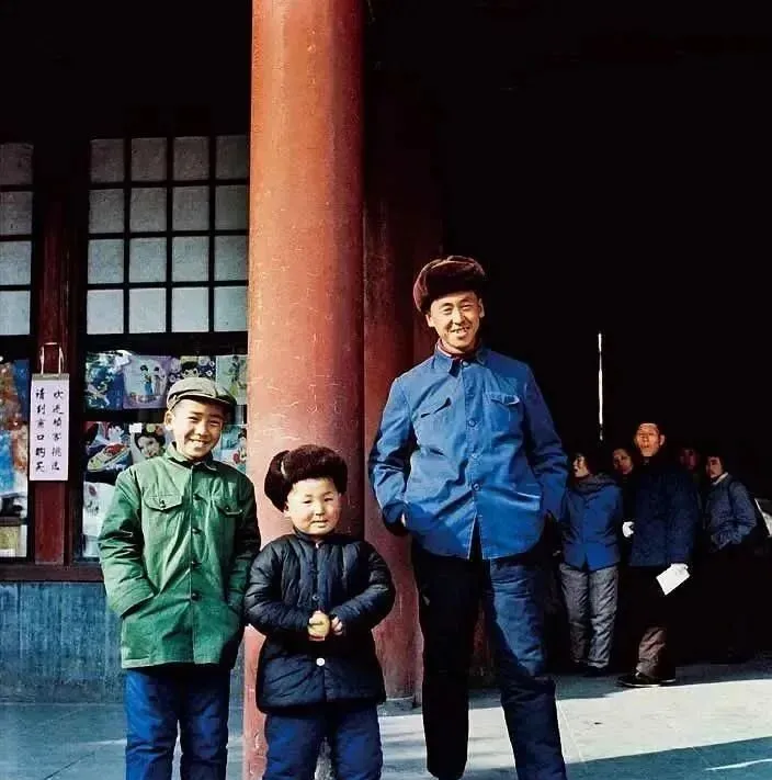 这个穿蓝棉袄的爸爸带着俩儿子,皮帽子压得低低的,笑容憨厚,旁边贴着宣传栏,字写得端正,那时候拍照是仪式,衣服得洗干净,脸也得擦亮。