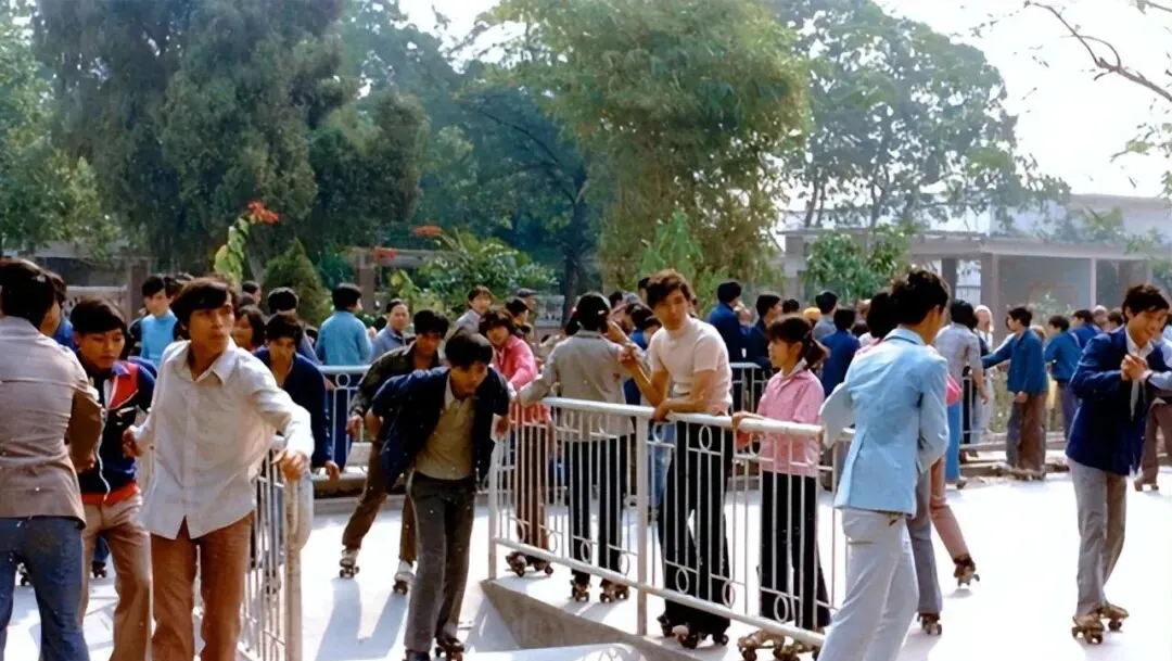 这块场地是旱冰场,围栏一圈都是人,鞋底四个轮子咕噜咕噜响,摔倒了拍拍裤腿再来,男孩扎着风,女孩笑着追,音乐从喇叭里抖出来,一首接一首。