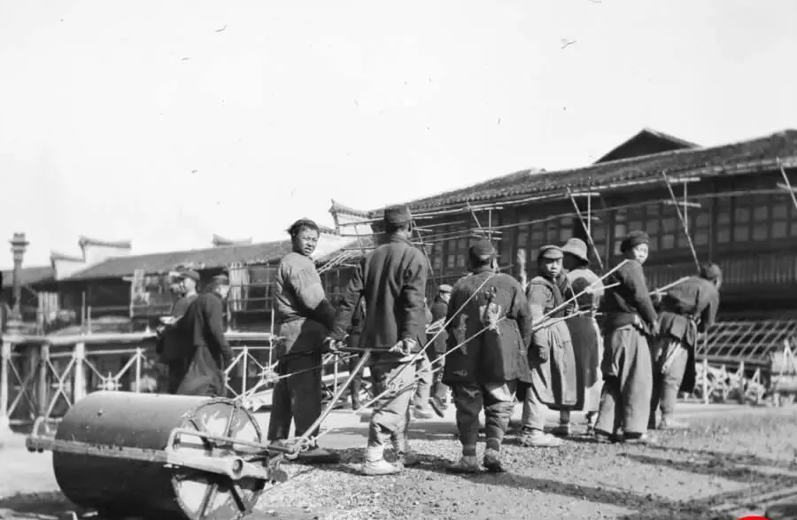 这个滚圆的家伙叫路碾子,铁皮包着肚,侧面两根木把搭着绳,十来个人一齐喊号子拉着走,石子路就被它一遍遍压服,小时候我在村口看过压场地的,咣当咣当地过,鞋底被震得发痒,可这张里头更拼命,肩头勒着粗绳,腰间搭着布带,谁也不喊苦,干完活能多换一碗热汤,那时候修一段路要人扛肩膀,现在一台压路机嘟嘟两遍就平了。