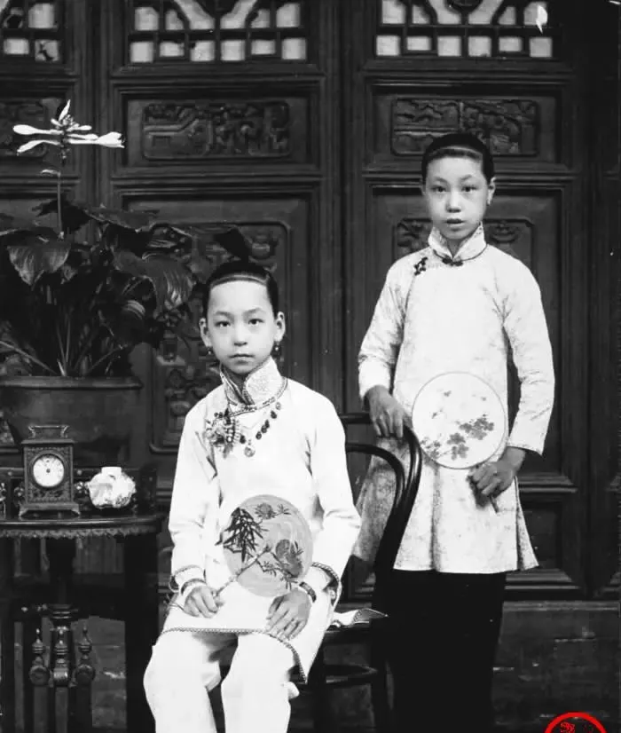 这个穿得细致的叫千金小姐,她手腕上串珠坠子叮当,衣料是细缎,立领滚银边,旁边的小姑娘捧扇站着,屋里摆了座小钟和盆景,背景是雕花隔扇,妈妈看照片就说,这样的女娃看着瘦弱,脑子里却藏着路,婚后一位成了大作家的母亲,后来自己也走出闺门去学画,这一张像把命运按下了快门,光阴往后跑,人还在镜头里等一句好评。