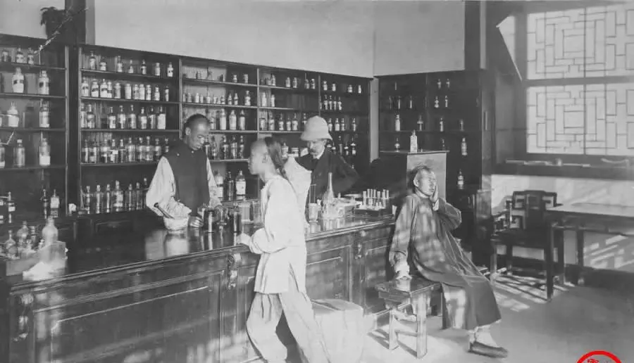 这个满墙玻璃瓶的地方叫药房,长柜台擦得发亮,瓶子里有颜色各异的液体和粉末,掌柜穿背心,旁边人戴着圆檐帽,像在兑药水,窗子上是几何纹的花格,光线斜斜照进来,我第一次进县医院打点滴就被消毒水味儿冲得抬不动头,照片里的药味我闻不见,只能看见中西碰头的那一瞬,柜角堆着量筒和滴管,样子陌生又认真。
