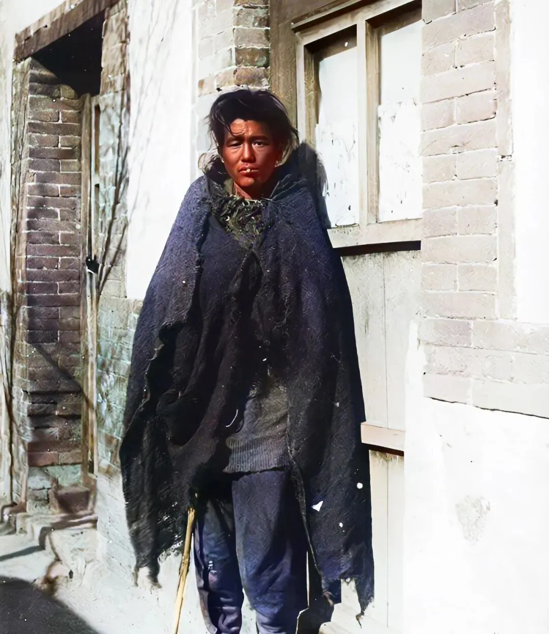 图中这位披着黑色粗呢破毯的男子,老辈儿人都叫他叫花子也有叫乞丐的,他靠着砖墙站着,毯子边角挂丝脱线,露出里面一件打了毛的针织衫,袖口发亮是常年磨出来的油光,头发乱成一窝风,眉心像是被冷风吹红了,嘴里叼着半截烟蒂,烟灰不抖直接怼着唇角,脚下是一双塌了跟的布鞋,前掌处隐约开线,看着寒气直往脚背钻。