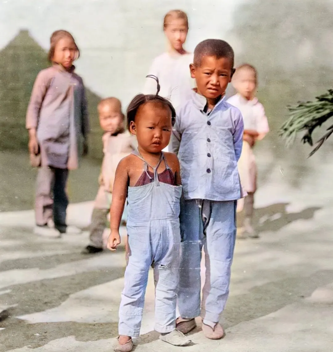 这个可爱的小家伙叫朝天辫,发顶抓一撮往上拧紧再用布条一系,呲溜就立起来了,她外头套着一件浅蓝色背带裤,裤腿长了点儿堆在脚背,里面露出红色小肚兜的边,晒得微红的小胳膊圆乎乎的,旁边是哥哥样子的孩子,扣子系得板正,神情一本正经地护着妹妹站位,后头还立着几个半大的,离得不远不近,都好奇地看镜头。