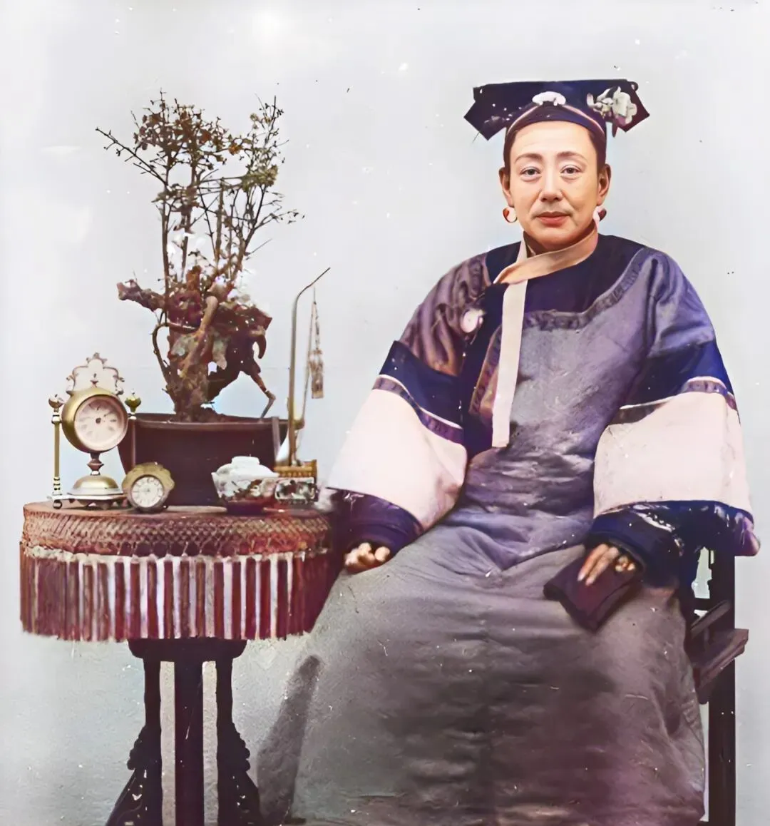 她身旁的小圆桌有意思,桌布绕了一圈长流苏,风一过能轻轻抖一抖,上头摆着两只西洋座钟,一大一小,铜架子擦得锃亮,还有一个水烟壶,银嘴细长,旁边是小巧的茶盏和梅花盆景,枝干老辣,拐着弯向上探,像把室内的空白一点点填满,这样的摆法在当年的屋子里不稀奇,讲究个中西碰面,新鲜玩意儿要有,老规矩也不能丢。