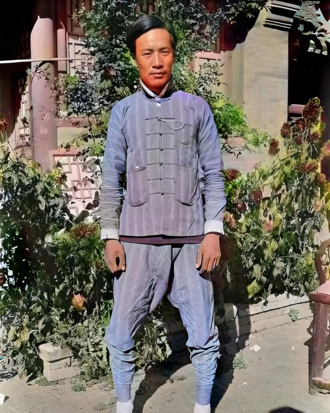 这个穿蓝灰对襟褂子的男子,一看身形和脚下的姿势就知道是干体力活的,裤腿扎得利落,脚上裹着白袜套,鞋底厚厚的方便跑街,胸前口袋处别着一枚小怀表的链头,亮光一闪像在报时,他双脚分开站定,肩背打开透着股自信,背后是红漆立柱的院子,回纹窗棂在阳光里投着影子,脚边一圈砖砌花池,栽着叫不上名的秋花。