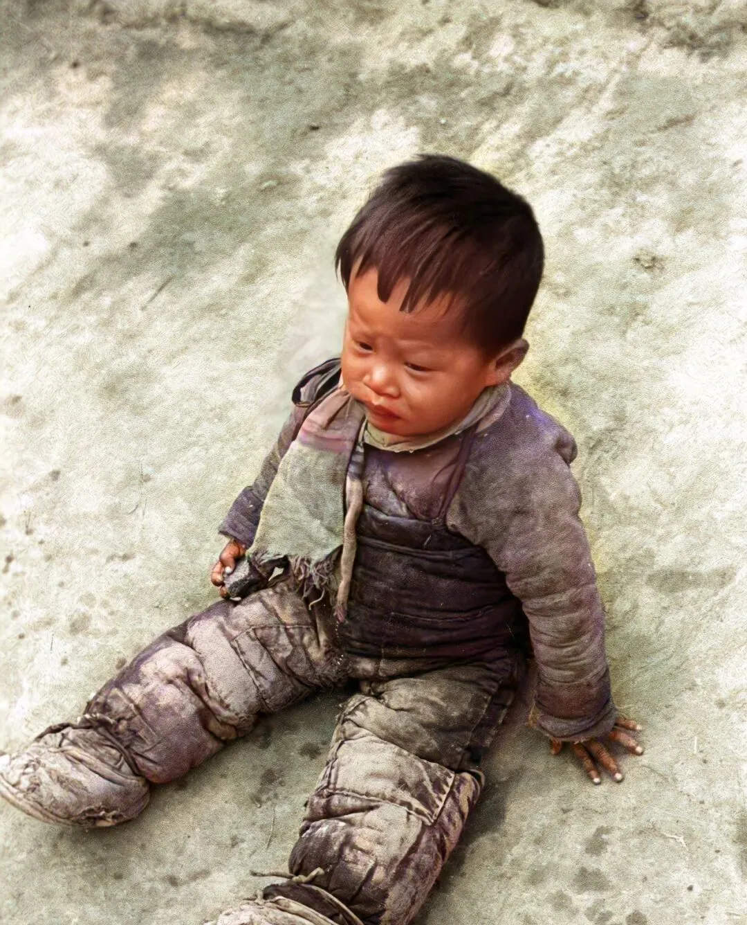 那会儿冬天地冻得邦邦响,地面结着硬壳,他就那么坐在地上,手掌撑着灰,脸上的鼻涕和泪一道糊下来,眼神里是怕生的紧张,摄影师俯下身时他还往后缩了一下,脖子上那条围脖边角磨成了绒团,颜色看不出原样了。