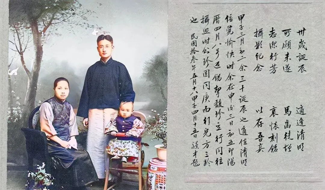 这张彩修的黑白照里,男人穿的是深色长衫马褂,三十来岁,站得挺直,女人坐在藤椅上,面相温顺,孩子穿小坎肩,脚搭在小凳边,照片右边那几行小楷,写的就是他给将来的自己留的话,“卅岁诞辰,适逢清明,所愿未遂,马齿徒增”,字不花哨,意思却扎心,三十而立没立成,心里还是不服气。