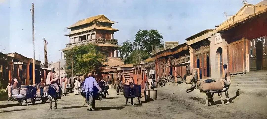 最后这一张把前头的话又应上了,城门、土路、行脚人,推车的、挑担的、骑毛驴的,一股脑儿往前赶,尘土被阳光一照就金灿灿的,过去的人忙着过日子,如今的我们忙着回头看,这些影像把桥搭好了,隔着这么多年,还是能听见城里那点熟悉的人声。