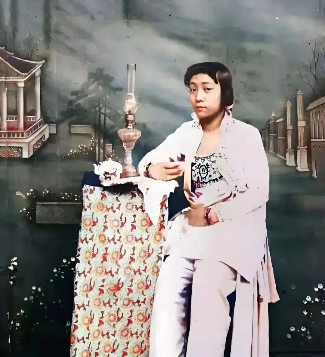 图中这位女郎坐在油灯旁,呢料披肩压着花边,贴胸小坎肩绣着繁花,她把相片夹在指间,眼神有点倦又有点拧劲儿,摄影棚的背景画得夸张,亭台水榭全搬进来,像把旧梦摆在台面上给你看。
