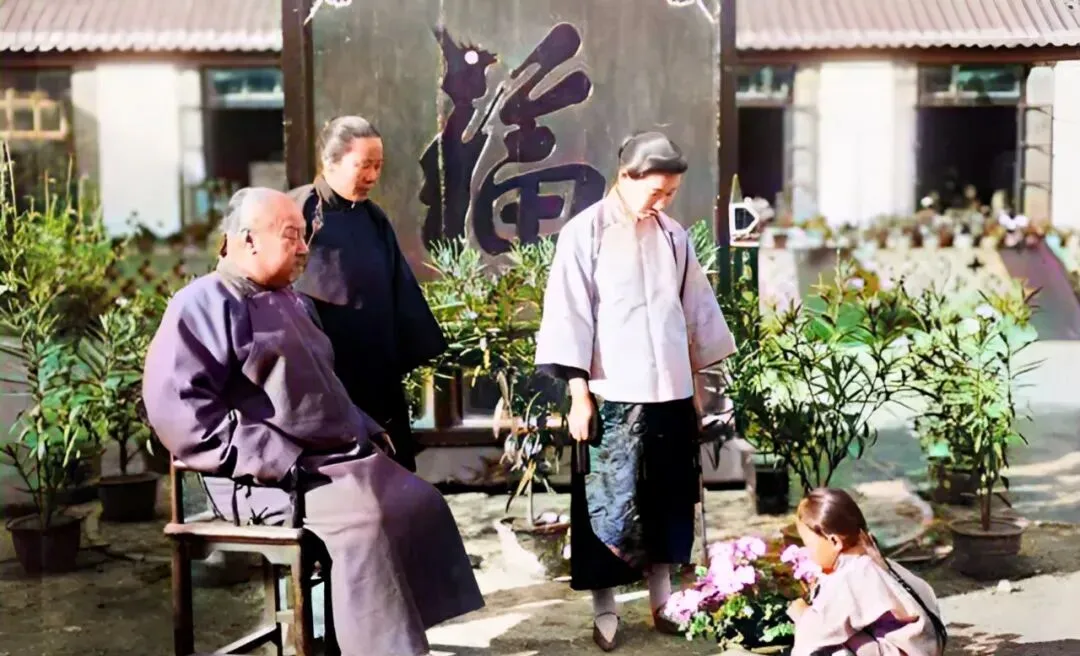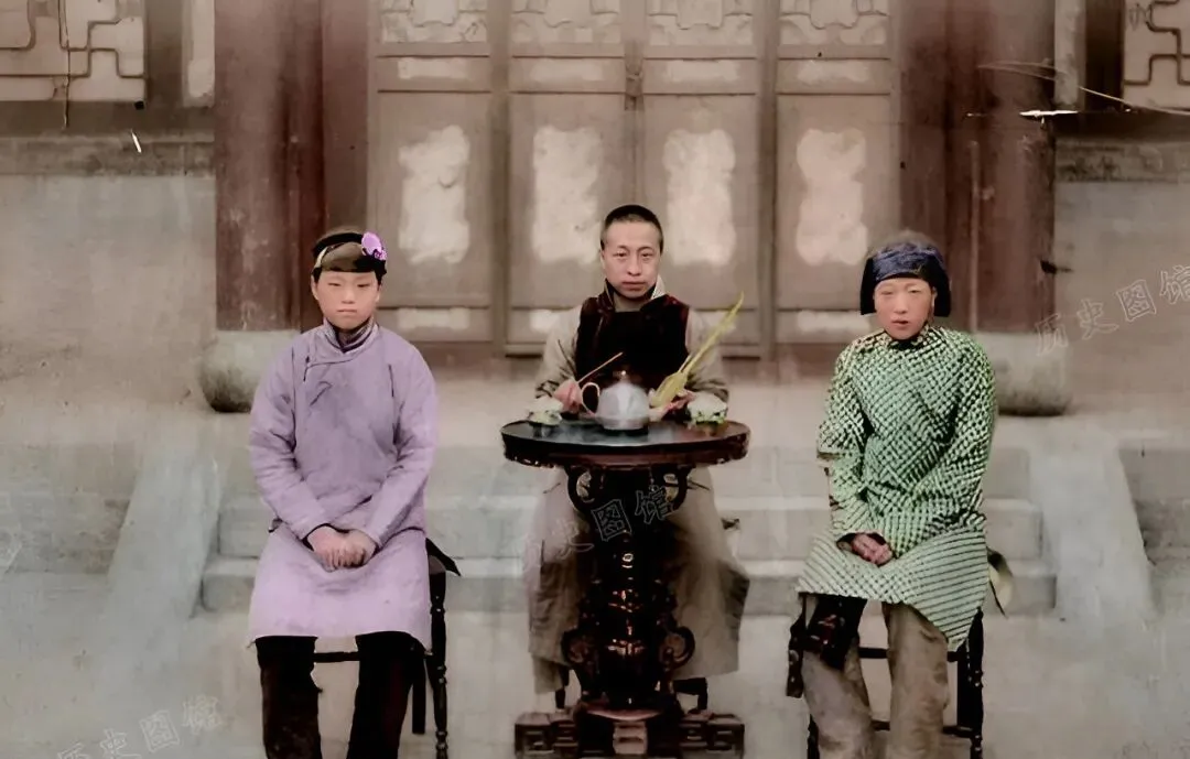 这个男人与两位女子的合影有点意思,桌上放着茶盏和水烟壶,一个穿嫩绿,一个穿淡紫,坐姿都规矩,谁是妻谁是妾没写明,反正眉眼都各有心事,老照片里的沉默最会说话。
