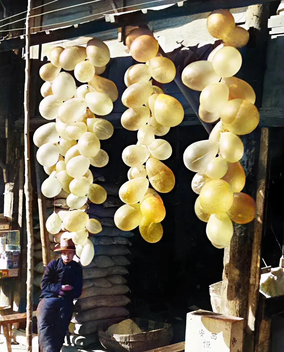 图上串成串的透明鼓包叫猪尿泡,店门口三股绳子一挂,阳光里泛着琥珀色的亮,老板说这可是药,晒干了入中药能治小儿遗尿,外地来的洋相机客人一愣,抬手就按了快门。