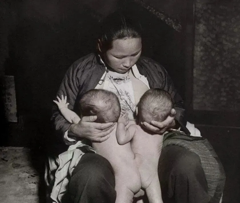 这张最揪心,年轻母亲抱着一对连体婴儿,孩子后腰贴后腰,手脚还软着呢,她低头护着小脑袋,胸前的衣襟被小手攥成皱褶,屋里光线暗,安静得只听见呼吸,奶奶看见说,做人当母亲,心就硬不起来了。