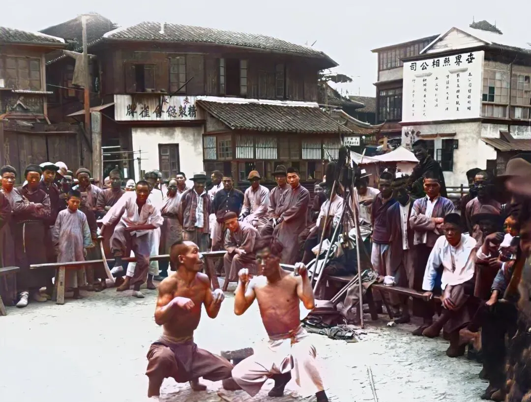 这个热闹场面是江湖艺人打把式,赤膊的两位一唱一和,拳风带着呼哧声,板凳搭成半圈,看客口袋里摸出两枚铜子儿,扔到褂子上当叫好钱,小时候我跟在大人后面挤,老远就记住那句看拳不化缘不地道。
