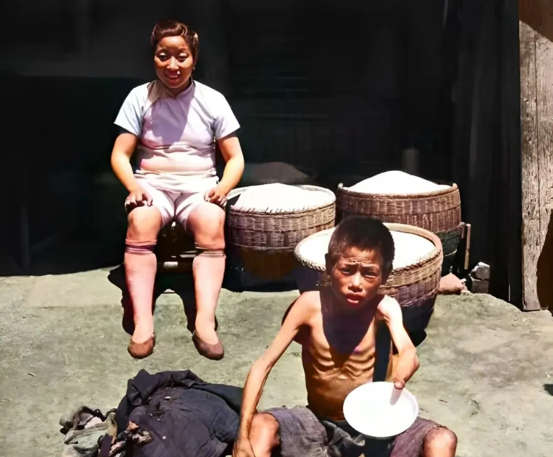 这张对比刺眼,米店老板娘坐着笑,怀里压着围裙,脚边的箩筐堆得鼓胀,而地上瘦得皮包骨的小孩端着空碗抬头,日头很毒,影子很短,人的命运却长得不一样。