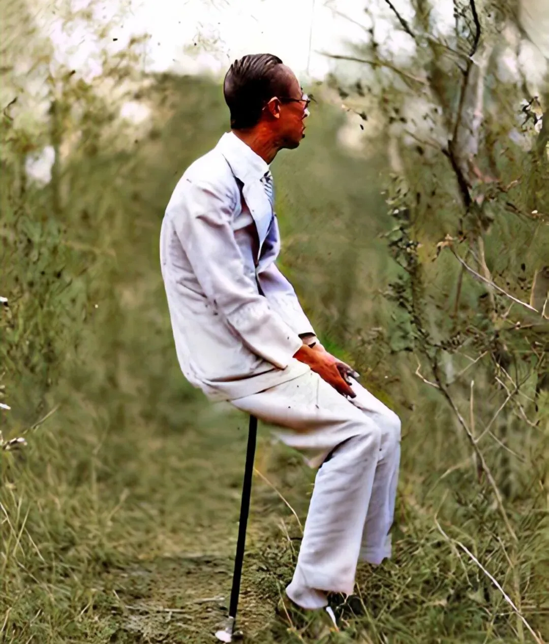 图中瘦削男子手里这根拐杖叫坐杖,杆子能分开,累了往地上一点就能坐,白西装在荒草里格外显眼,他望着前头的灌木发呆,像把自己从喧嚣里抽出来,坐一小会儿再把日子接回去。