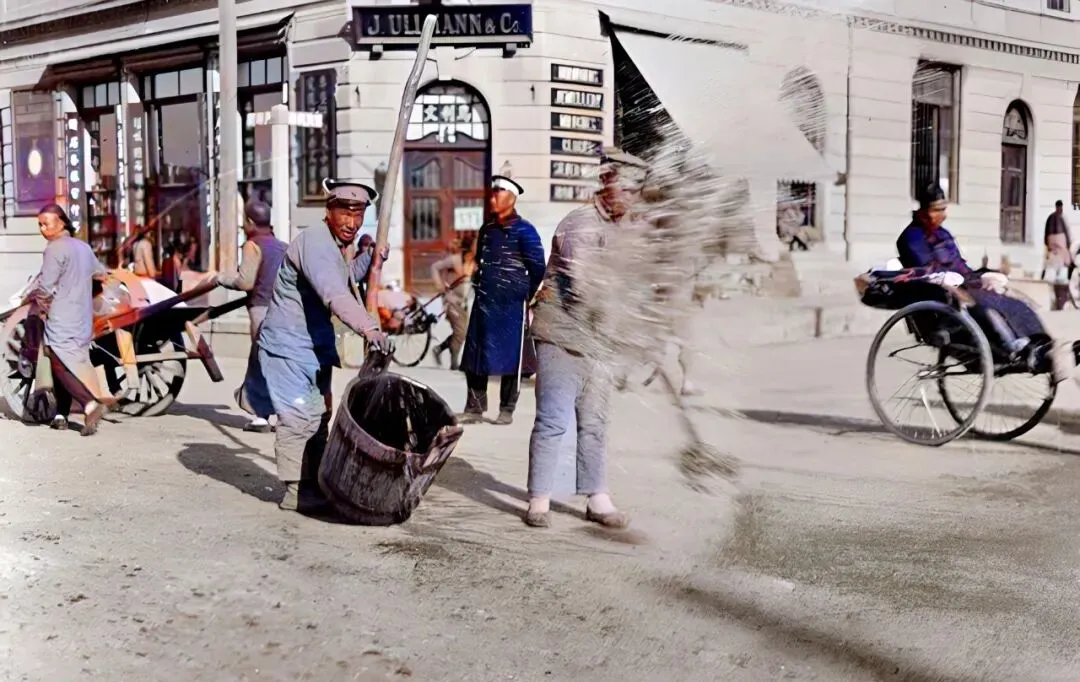图里拿长瓢的两位穿制服,是当年的警察兼清洁工,前面一人抬木桶,后边一瓢一瓢泼出去,泥路立马服帖,黄包车从旁边一划,车夫回头喊一声小心点,这活儿不体面却顶用。