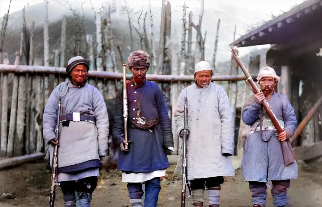 这四位看着像洋人,其实是新疆的回族队伍,枪支各不相同,腰间还斜插着左轮,脸上被寒风刮得发亮,站成一排谁也不笑,眼神里透着一股倔。