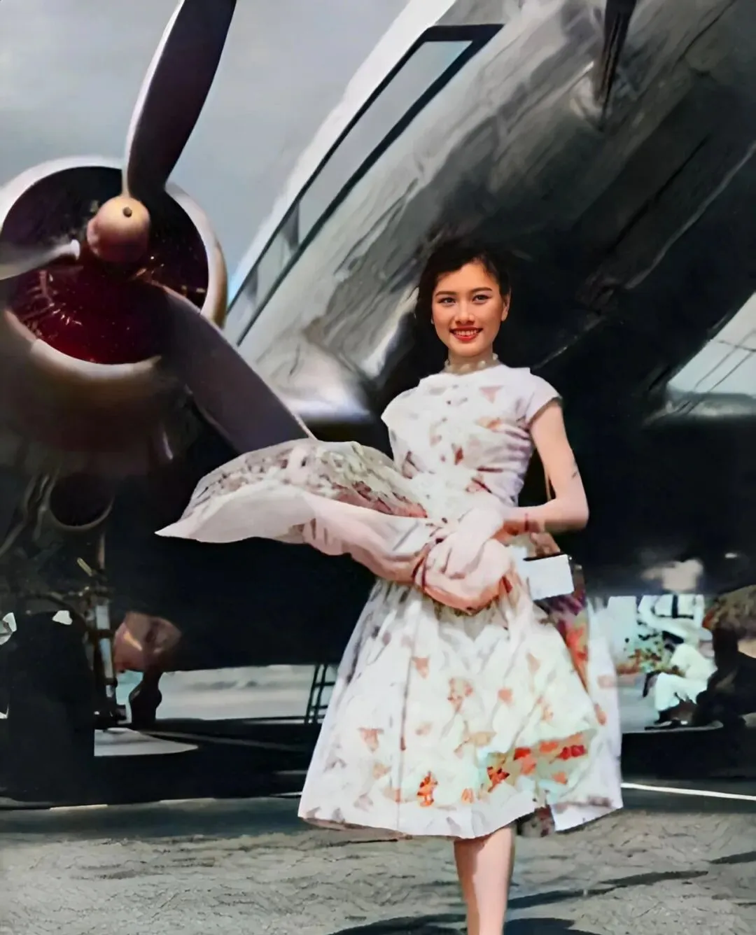图中这位就是唐瑛,裙摆被风扬起来,笑容落在镜头里亮堂堂的,身后是飞机螺旋桨,时髦得利落,像把城市的光一点就着,妈妈看了感叹一句,那时候的上海,走路都带风。