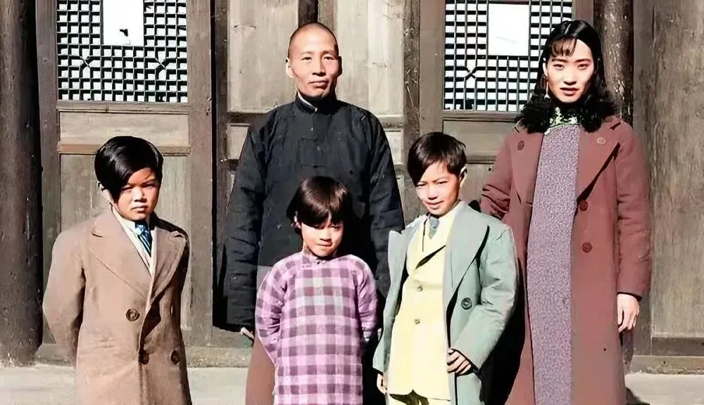 这家人的穿着新旧混搭,孩子们的小西装宽宽大大,母亲的呢大衣颜色沉稳,父亲站在中间不笑,门扇上格眼密密的,风一吹,衣角一齐抖,镜头把风也按住了。