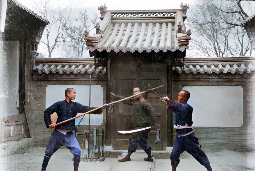 这张拍在河北定州的院里,长枪挑着月牙铲,双刀一沉一提,门楣上兽吻冲天,砖地被脚步点得啪啪响,师父在旁边看着不吭声,一会儿才说,收着,气儿别散。