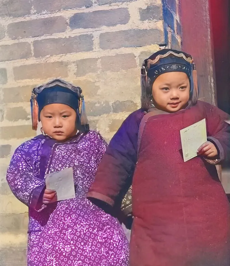 图中这对小朋友手里攥着的叫相片,薄薄一张纸面微泛光,边角还没来得及抹平,女孩戴着小帽,紫团花棉袄一看就是新做的,另一位小家伙围着厚厚的夹袄,脸蛋肉嘟嘟,像刚被人捏过一把,嘿,第一次看见自己的样子被“印”出来,难怪有点懵,摄影棚外的砖墙灰里发白,说明天儿挺干,师傅估计刚把底片从药水里捞出来不久,就递过去让孩子们认认人。