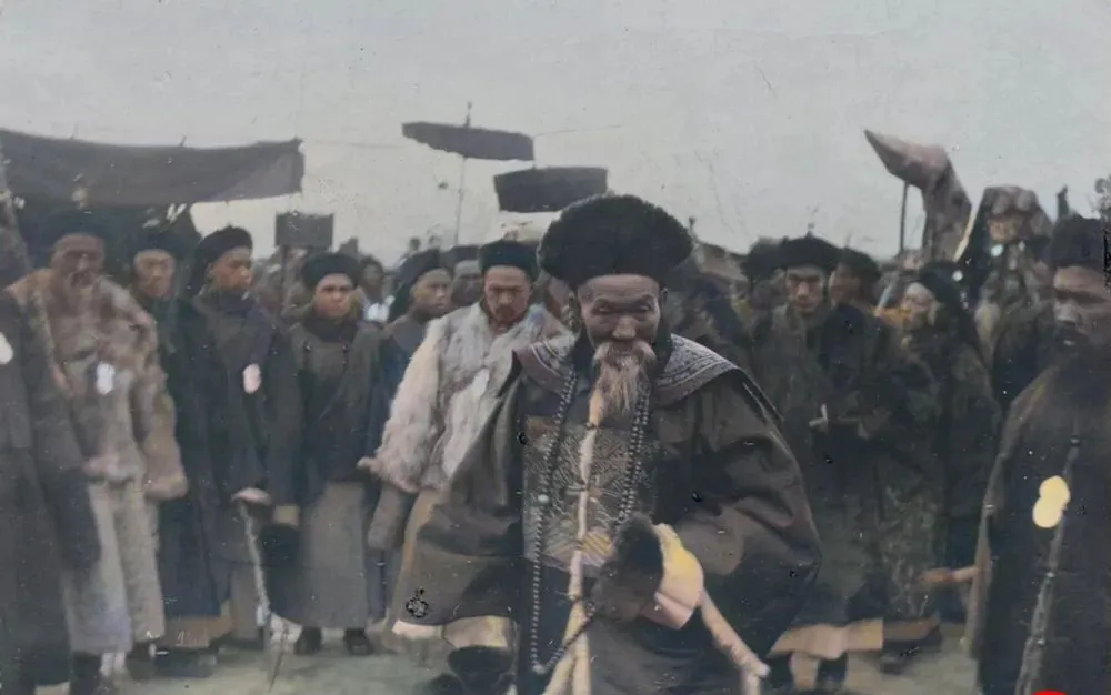 这个打扮叫文官补服,胸口的补子隐约看得出纹样,帽子压得很稳,胡须被风拂得有点蓬,前后簇拥的人把他当主心骨,场面并不喧哗,反倒显得压着劲儿,奶奶说那会儿赶县里的公差,最怕的不是跋涉,是别把牌子上的差事念错了名字,丢不起这个人,现在开会一部手机就能把流程排好,以前靠的可都是嗓门和脚程。