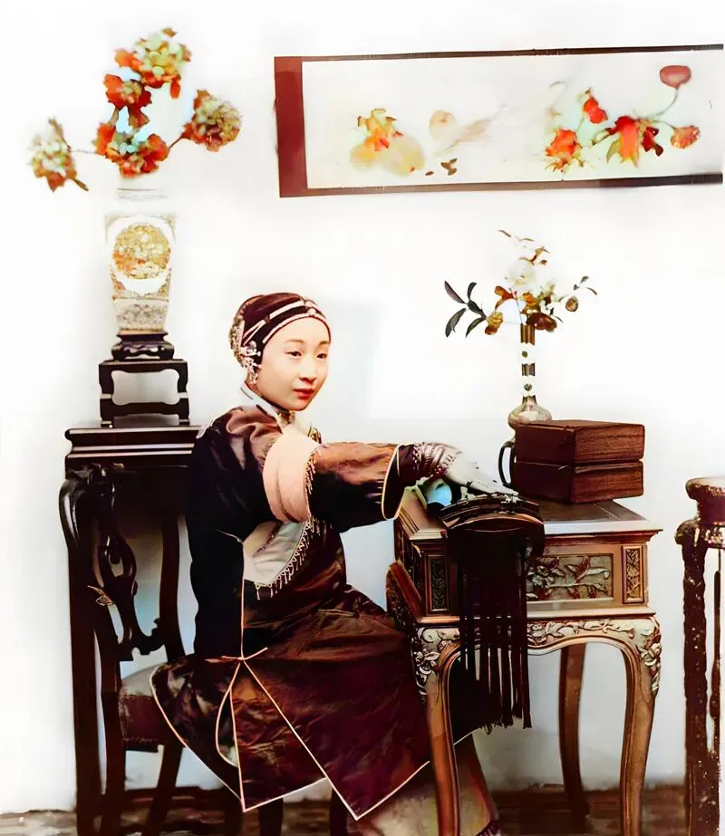晚清彩色老照片:名妓轻抚琴弦气质高雅,母子合影摆pose笑逐颜开。