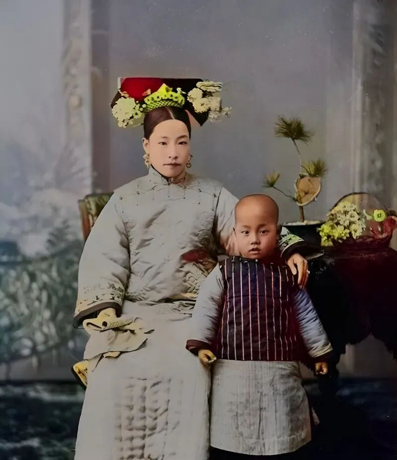 这个发饰叫大拉翅,宽宽地托在发髻两侧,绒花压着翠片,母亲手背微微托着书,指尖戴着护指,孩子穿着竖条纹的比甲,眼神直直地盯着镜头,像在等大人说可以动了,爷爷说旗人家对礼数看得重,坐姿要正,说话要稳,照相时不许乱眨眼,这样的板正到了现在,变成一家人逛商场时让娃别东张西望的小叮嘱了。