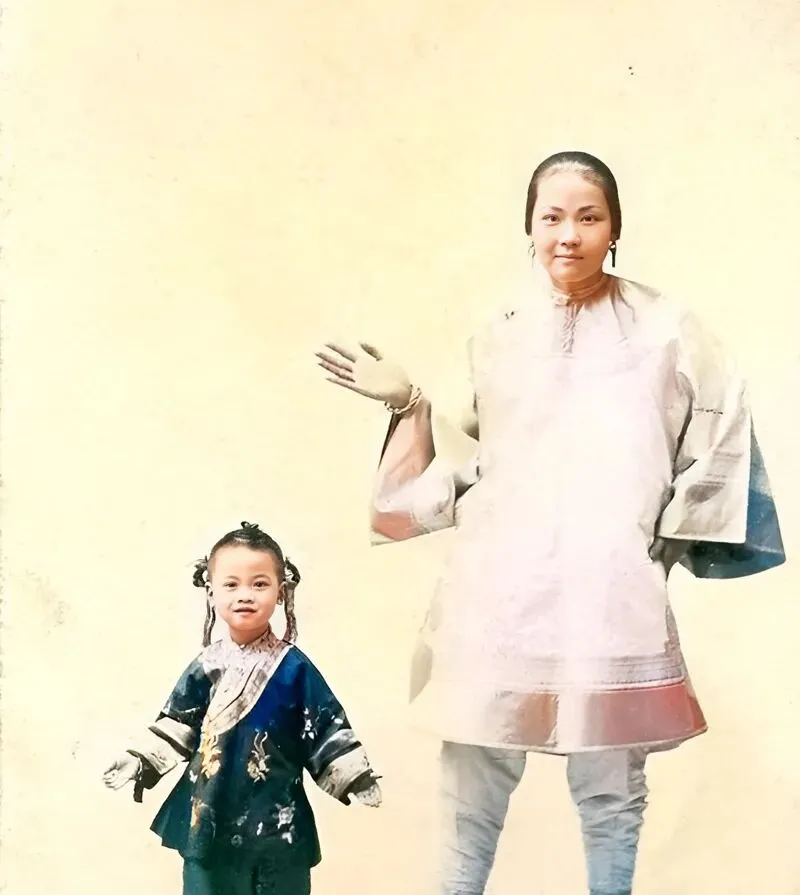 这个站位就叫摆pose,娘俩都戴着手套,母亲抬手像在示意小家伙往这边靠靠,孩子的小辫梢用穗子系着,衣襟上的绣线在光底下泛着亮,笑意从嘴角往外冒,快门再慢一拍都兜不住,家里人打趣说,这张照得喜气,当年放在堂屋能旺家运呢,现在拍亲子照讲究主题背景,老底片里只要人笑了,天就亮了一层。