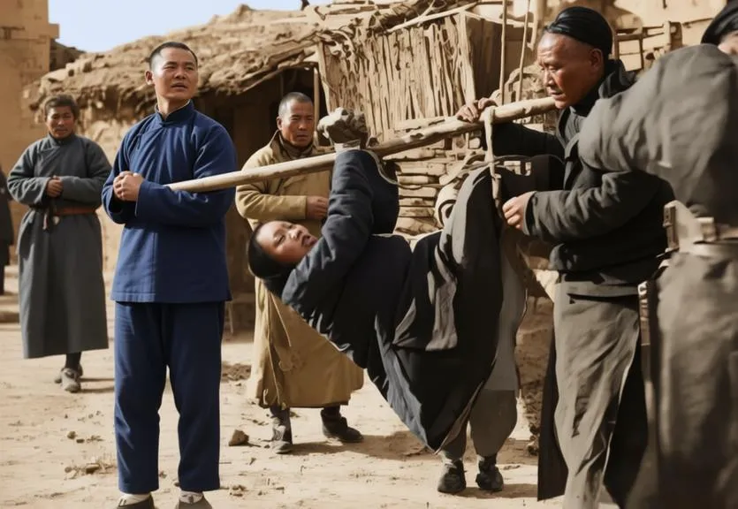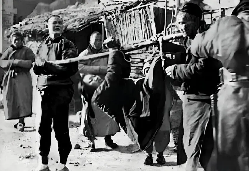 1942年12月28日,华北,一名年轻女子被反绑双手,像捆猪一样横卧在一根粗木杠上,几名壮汉抬着她穿街过市。女子披头散发,哭声撕裂冬日的寒空,引来了数百围观众众。几名日伪警察非但不阻拦,反而兴致勃勃地架起相机,拍下这张“趣味照片”。