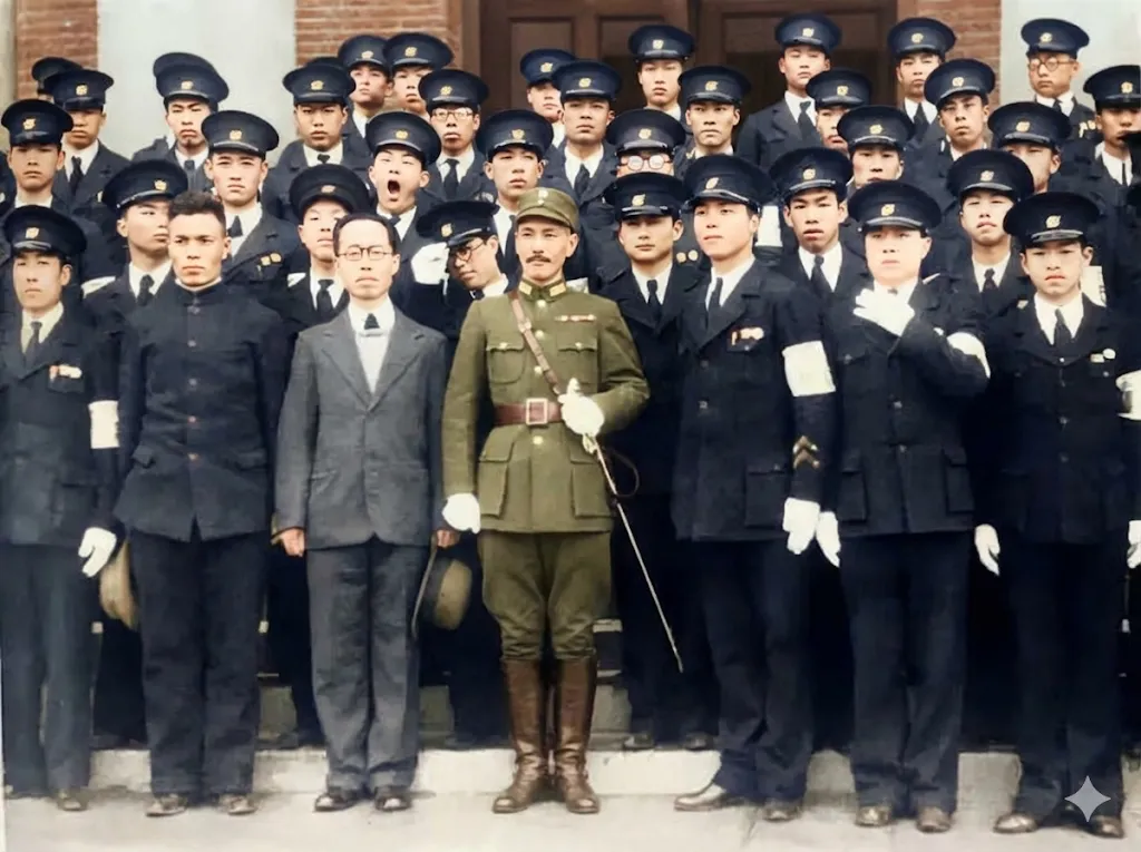 画面里,蒋介石身着军装站姿规整,尽显军事领袖的威严;而周围学员的状态却颇为鲜活——左上方甚至有位学生正打哈欠,这种“严肃与松弛”的反差,意外地保留了历史场景的真实感。