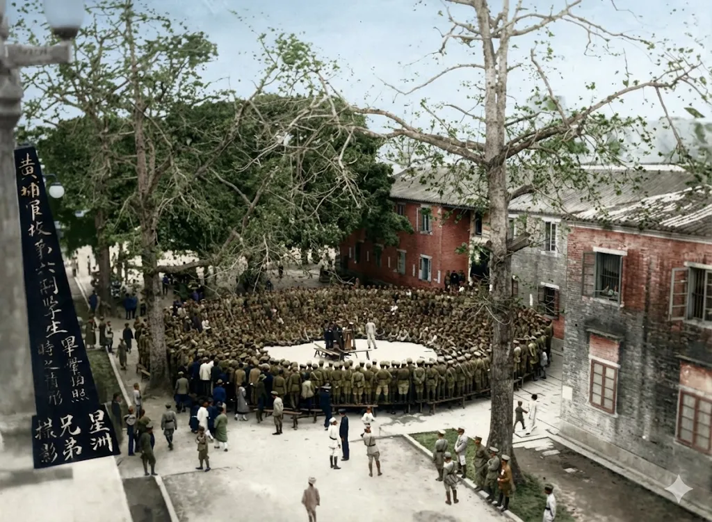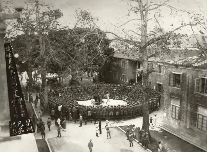 1929年6月29日,广州黄埔军校长洲岛操场,3500名第六期毕业生围成一个完美无缺的同心圆,左侧竖幅文字 “黄埔军校第六期学生毕业留影 星洲兄弟摄影”