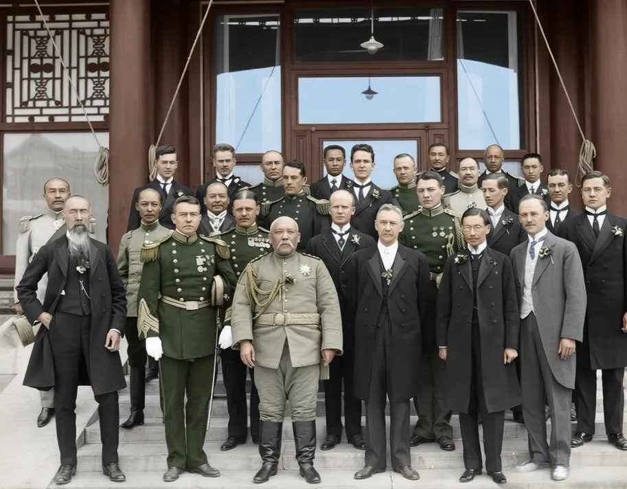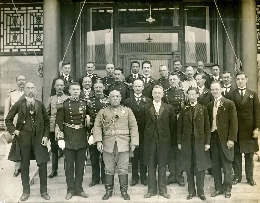 1913年10月10日,北京总统府(今中南海新华门)前,这张照片定格了中国近代史的转折一刻:袁世凯身着戎装、双手扶剑站在台阶最前排正中,正式接受各国驻华公使的集体觐贺,成为中华民国首任正式大总统。