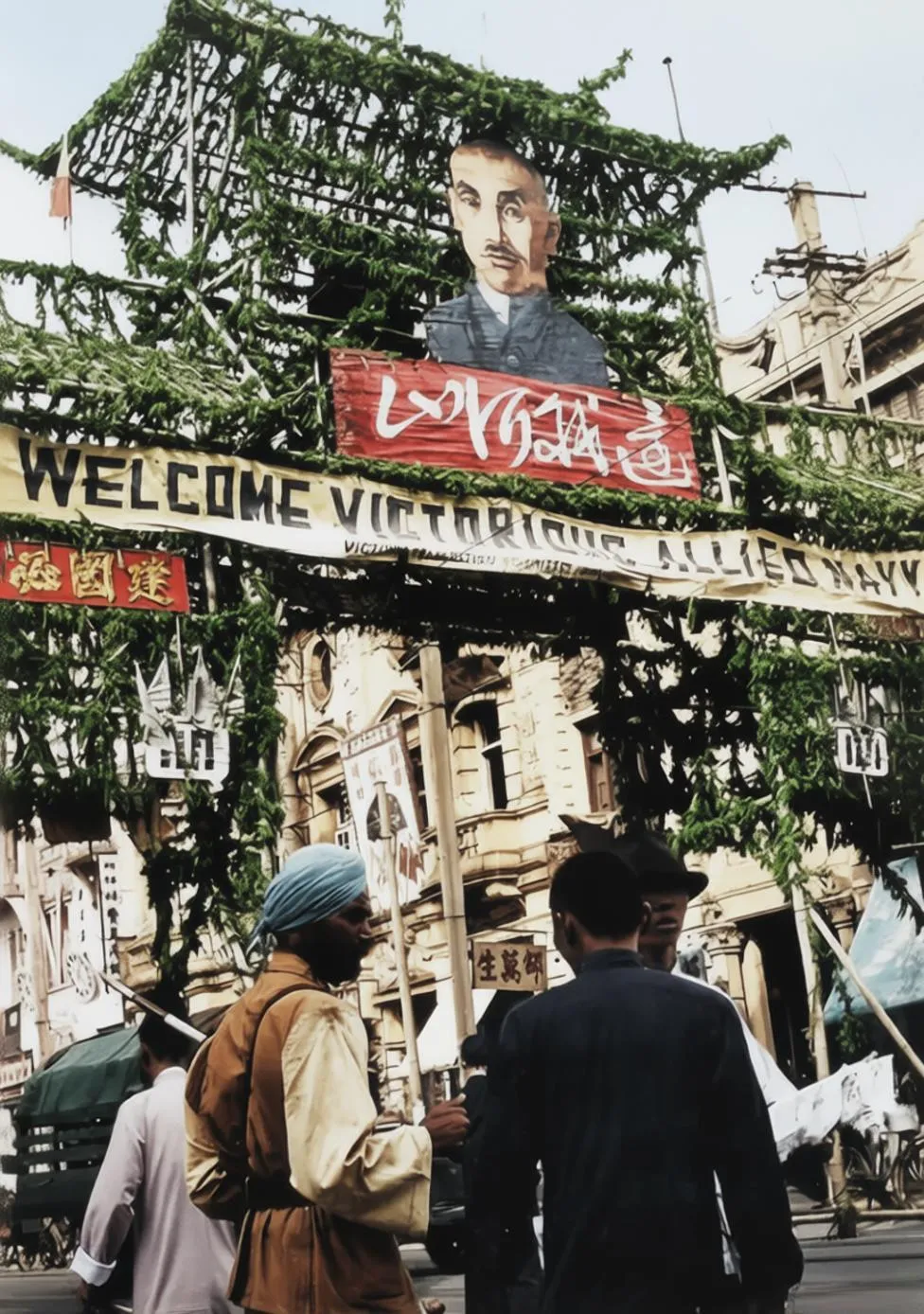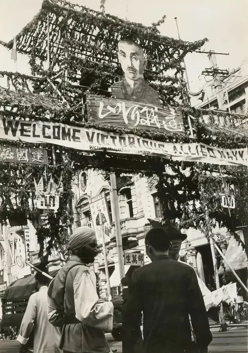这张照片定格了1945年上海南京路庆祝抗日战争胜利、欢迎盟军的历史瞬间,画面中的临时拱门以竹木结构搭建,顶部悬挂着蒋介石的巨幅肖像(彼时他是中国战区最高统帅)。拱门中央的横幅用中英双语书写“WELCOME VICTORIOUS ALLIED NAVY”(欢迎胜利的盟军海军),下方还有中文标语“建国必成”。