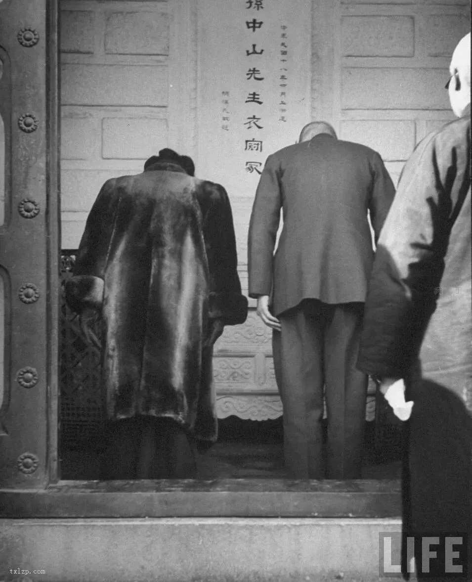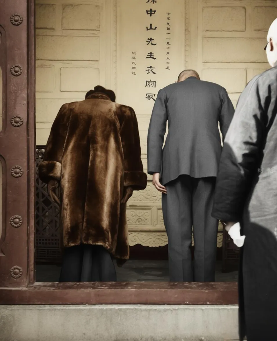 蒋介石身着中山装,宋美龄身着貂皮大衣,向孙中山灵位三鞠躬。1925年孙中山逝世时,蒋只是黄埔军校校长,地位远不及汪精卫、胡汉民。1945年他以“国家元首”身份拜衣冠冢,实际上是向全国宣布:我蒋某人才是孙中山的真正继承人。
