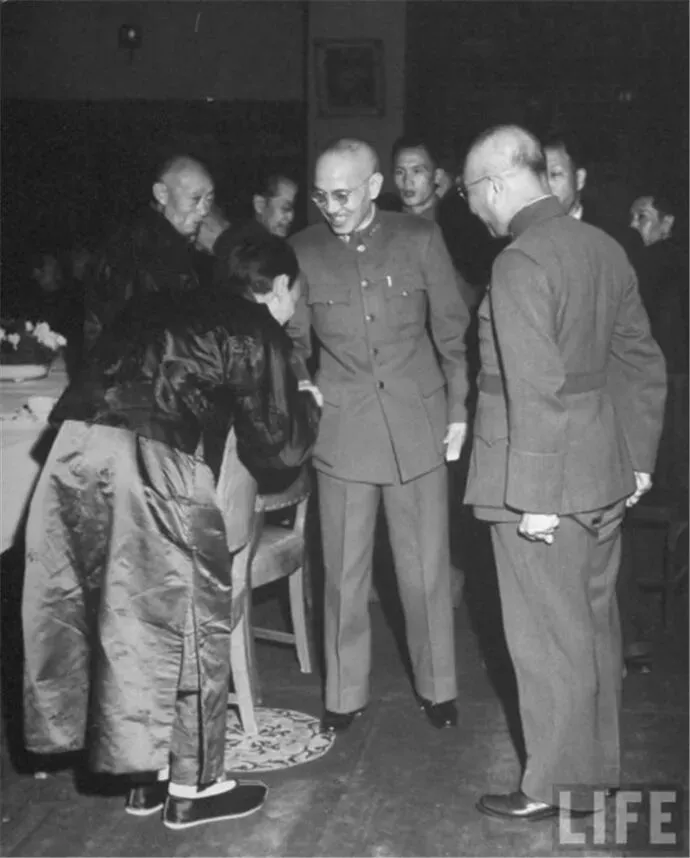 这张照片定格于1945年12月,是抗日战争胜利后国民政府“接收”北平后,画面中蒋介石身着国民革命军将官常服,在中南海怀仁堂等地会见北平士绅、学界代表。