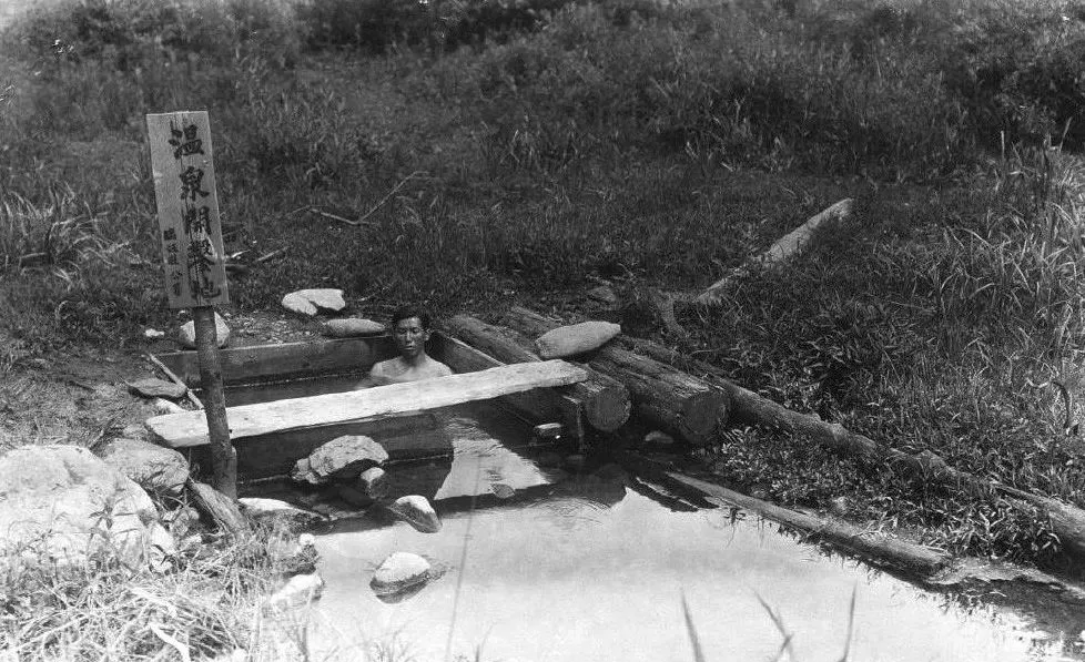 牌子上写着温泉开鏧处,木头围了个小槽,热气在水面打转,男人半身泡着,脸上松快得很,东北冷,能在山坳里遇上这么一池热水,算是老天疼人。