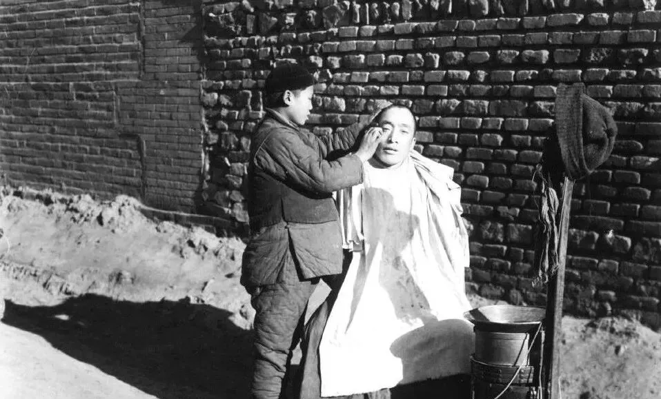 这个挑担子的就是理发匠,一头是炉火和脸盆,一头是剪刀剃刀,布一围,脸一抹,咔嚓咔嚓两下就利索,爸说以前剃头还顺手掏耳朵,讲究得很。
