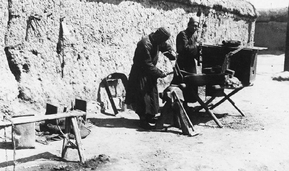 这俩人正对着火口干活,一人拉风箱把火提起来,一人举锤子趁热打铁,火星子往外蹦,叮当声一响,街坊就知道又该打镰磨刀了。