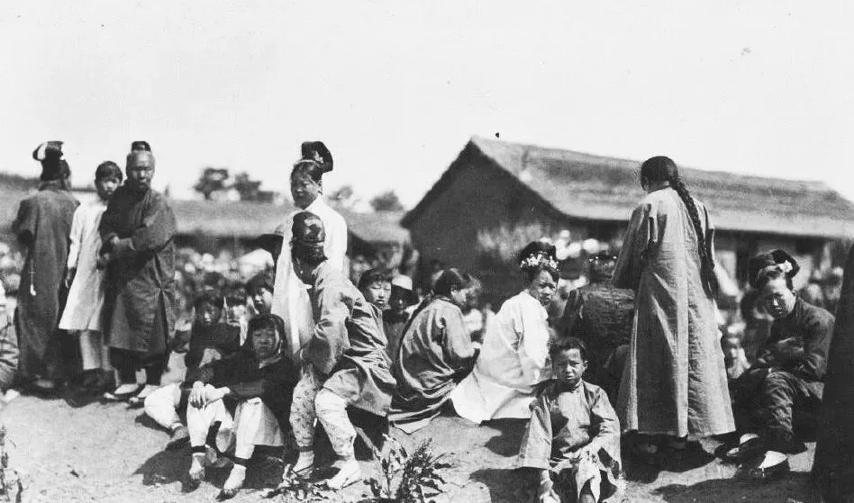 这群穿旗袍戴旗头的,是满族发女,站在村边看热闹,耳坠在阳光下一晃一晃,衣角摆得直,走起路来有股端正劲儿。