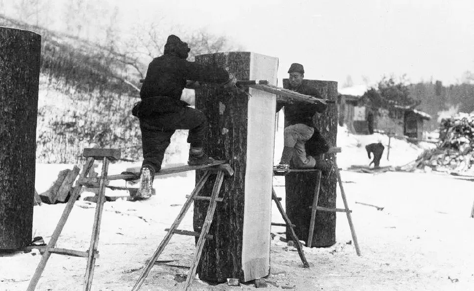 两名工人踩着高架大锯对拉,原木被分成规矩的板子,雪地里锯末子一层层铺开,脚底下吱呀作响,手一松可就砸脚背了,干这个得心细。