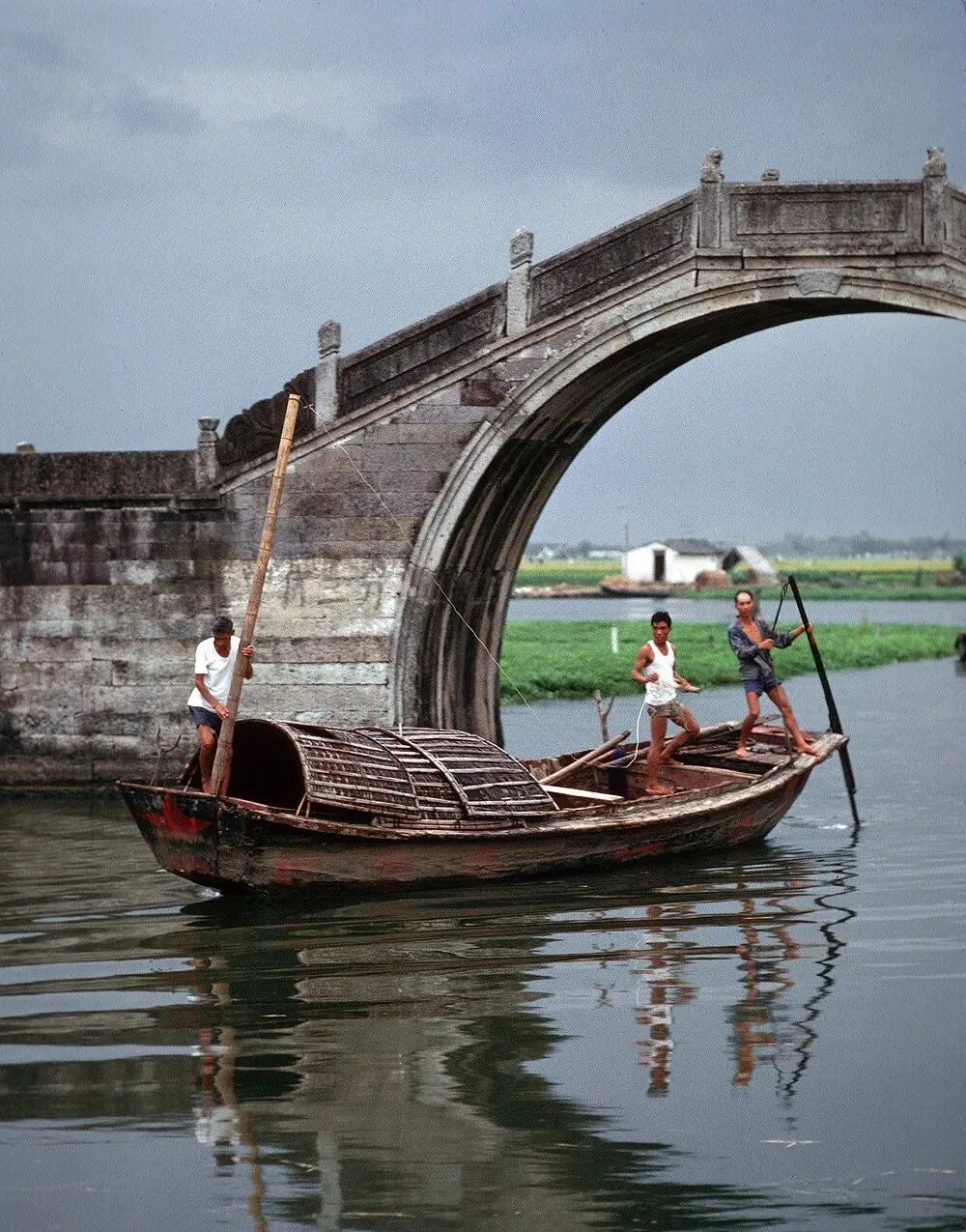 图中这座古桥叫太平桥,一拱连八梁,石料打得紧实,桥面两侧的栏板上有琴棋书画的刻纹,桥洞倒映下去刚好一轮满月,船家穿背心赤脚站船头,一篙撑过去,真应了那句舟行碧波上,人在画中游。