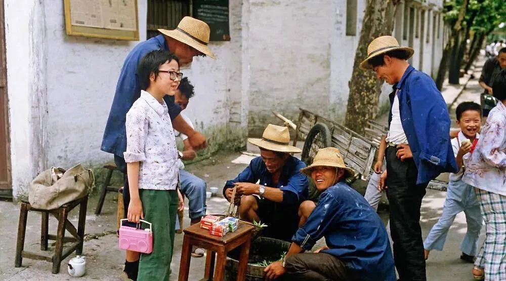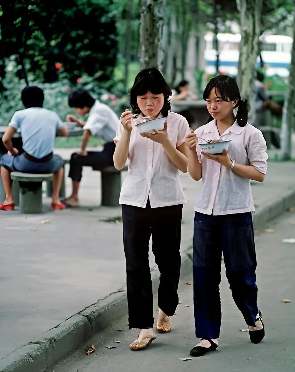 这个搪瓷大碗里是热腾腾的面,两个姑娘边走边吃,鞋底是绣花塑料拖,吸溜一声,汤气直往脸上扑,青春就是这么省事。