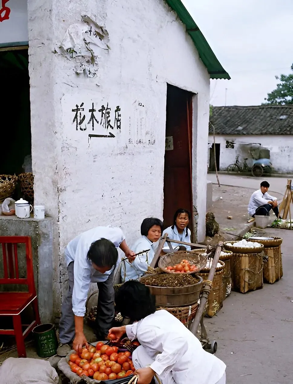 墙上这行黑字写着花木旅店,箭头指进去就是个小院,门口一溜番茄和大葱,挑担的把竹扁担靠在门框,抹一把汗,问一声“还住不住”。