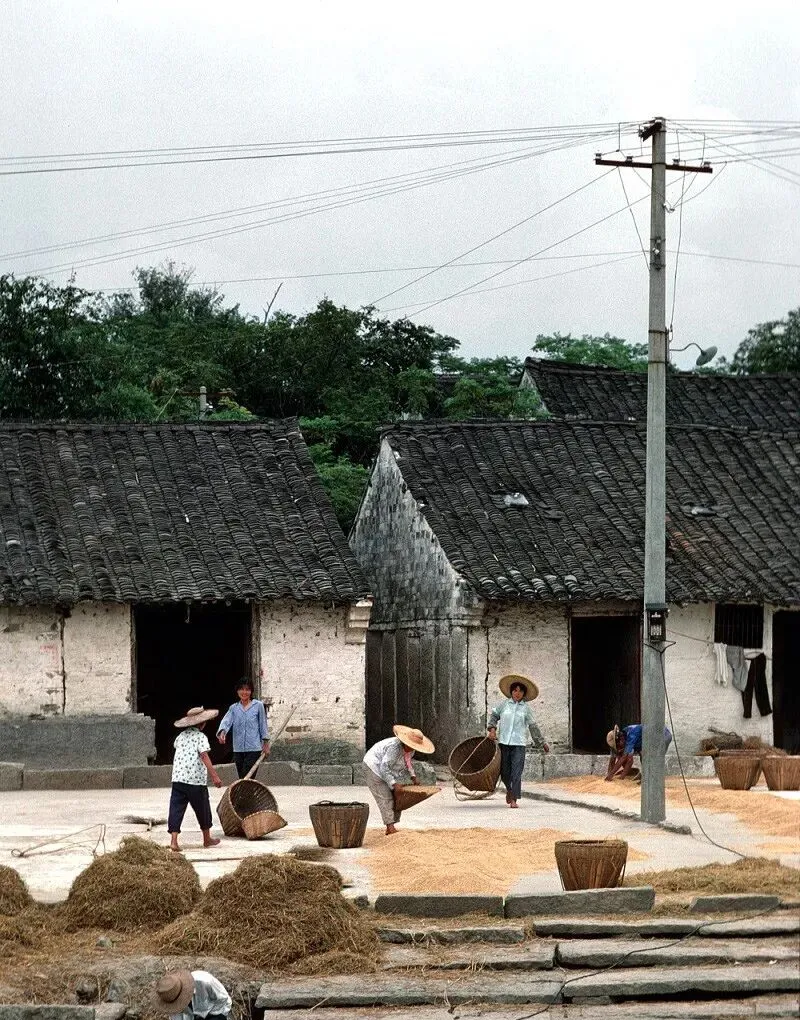 这排墙皮斑驳的老屋,门前码着一摞摞黑瓦,屋后有鹅咯咯叫,两个人倚在门框上说话,孩子从稻草堆里探个头,生活的热乎劲就这么往外冒。