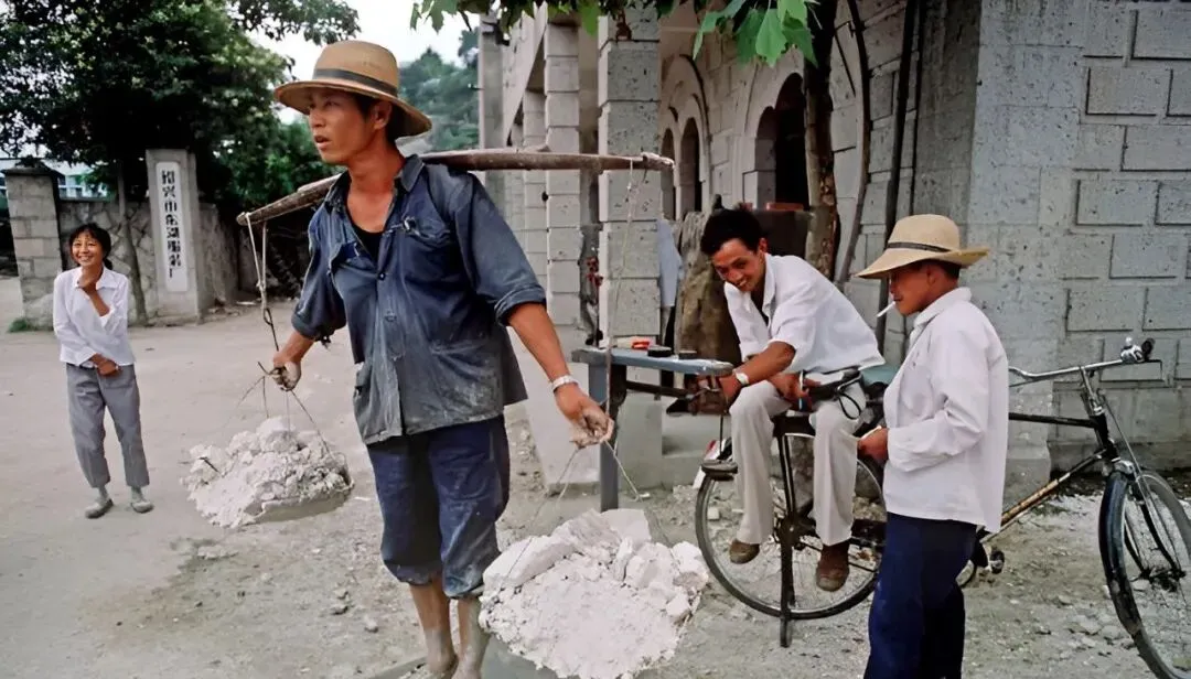 这个木担子挑着两筐白乎乎的石灰,汉子赤着脚站上秤板,坐在自行车上的记账员抬手一写,叮当一声,工分到手,笑也到眼角。