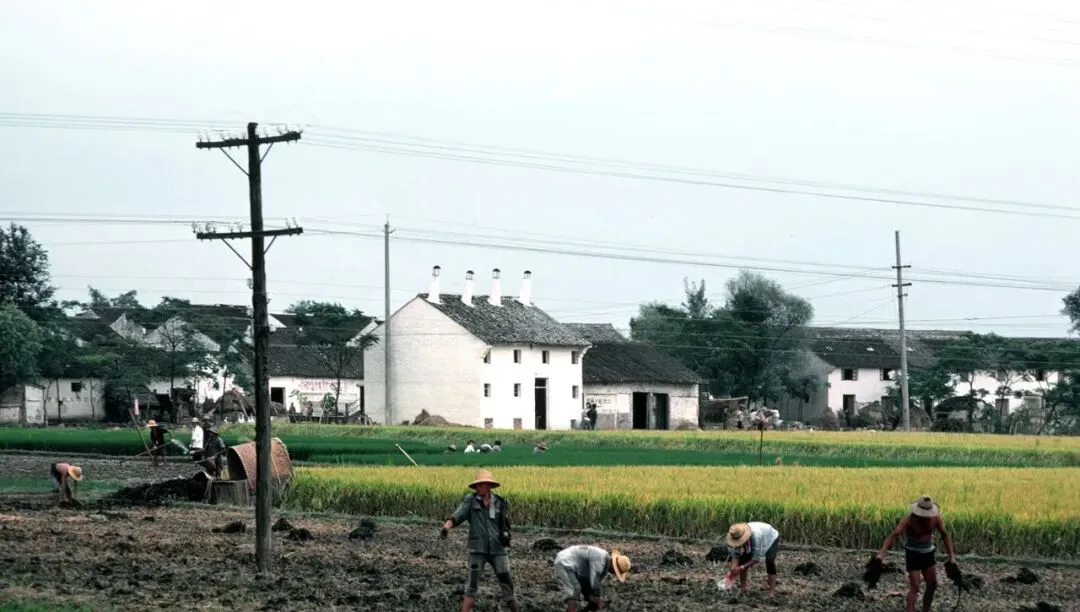 这幅里田埂细得像线,白墙黑瓦的房子立在远处,电线拉成弓,农人弯着腰插秧,裤脚卷得高高的,泥从脚背滑下去,凉嗖嗖的。