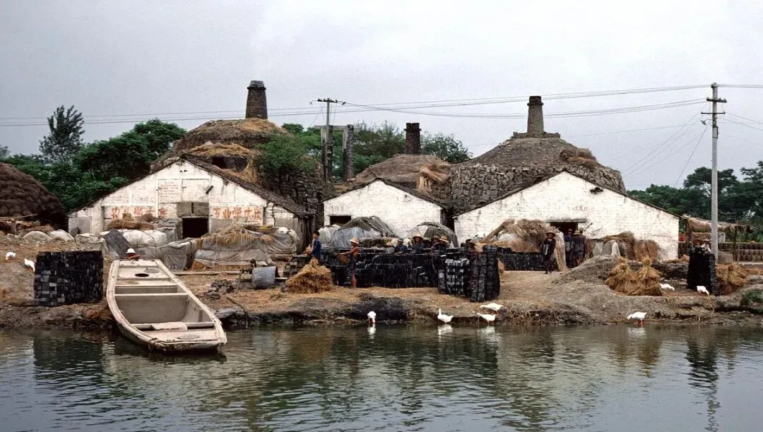 这张里黑砖码成墙,窑门口稻草堆得像小山,师傅把草往火口一塞,火苗“呼”的一下窜高,旁边白鹅在水边挑脚,河面上冒着热雾。