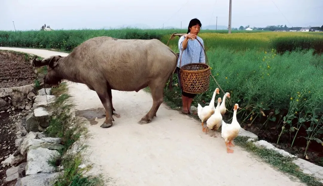 这位大姐肩上挂竹篮,右手一挥,四只白鸭排着队,水牛慢吞吞挡在路当中,油菜花把田坎染得黄亮,走在后头的人,脚步都会放慢。